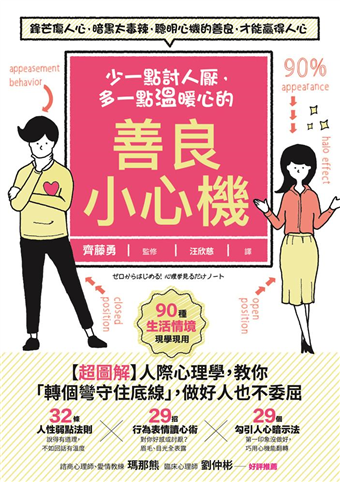 在社會走跳,沒心機只能委屈自己,城府深容易被討厭。想要人見人愛,不必奉承拍馬屁,日本心理學權威「齊藤勇」教你善用人性弱點,耍點「善良小心機」,就能少一點討人厭、多一點溫暖心,輕鬆贏得好人緣——