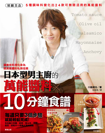 在本書中,他以水煮番茄罐頭、巴薩米克醋、橄欖油、美乃滋、鯷魚罐頭這5種調味料,變化出24款可以無限活用的萬能醬料,並設計了72道搭配醬料的時尚料理;內容包含義大利麵、前菜、魚&肉、沙拉、蔬菜、甜點,每一道的作法都超簡單,只要3個步驟就能輕鬆完成。過程雖然快速,但味道一點也不馬虎,甚至可說宛如義大利餐廳端出的美食。只要擁有這本萬能醬料食譜,無論是家常菜或宴客料理,肯定都能讓你輕鬆愉快地做出媲美名廚的佳餚。
