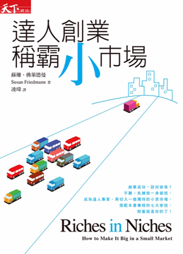 在經過「藍海策略」和「長尾理論」的洗禮後,沒有人懷疑小市場能創造大財富,甚至假以時日,小市場也可能變成大市場。但當個人創業時,究竟要如何深耕小市場,做一個瞄準利基市場的達人創業家?蘇珊.佛萊德曼的《達人創業,稱霸小市場》帶領讀者按部就班思考「利基創業家」在創業前的必要決策,包括評估你的專業性與獨特性、選擇產業、選擇產業中的某個區塊、選擇在哪個地區創業;接著作者提出七大實用密技,協助讀者創業成功──取個好名字,建立媒體力量,與產業打好關係,練習寫作,製造產品和建置系統,教學,提供服務。最後,作者簡要勾勒創業成功後面臨的挑戰。