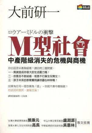 你自認是中產階級嗎?請自問三個問題:一、房貸造成你很大的生活壓力嗎(或是你根本不敢想購屋置產)?二、你打算生兒育女嗎(或是你連結婚也不敢)?三、孩子未來的教育費用讓你憂心忡忡嗎(或是你連生孩子也不敢)?三個問題,只要你有一個的答案是負面的,我們就必須跟你明講—您不算是、不再是中產階級了,富裕和安定,正離你愈來愈遠……。該怎麼辦?你必須看看大前研一這本撼動日本上班族的新書!大前研一這本書今年初在日本出版,直指目前日本及全球普遍的發展趨勢,對照台灣的現狀,令人警醒驚懼。代表富裕與安定的中產階級,目前正快速消失中,其中大部分向下沈淪為中、下階級,導致各國人口的生活方式,從倒U型轉變為M型社會。大前研一大量引用數據與數字來佐證他的理論,並提出解決的辦法,其實,商機也正浮現出來,少數有洞察力的企業已經開始獲利了。一九八五年開始的「新經濟」浪潮,是造成M型社會的最大原因。一進入九○年代,經濟即陷入長期衰退—其實不是衰退,而是經濟社會結構已經變了,不再是經濟學家傳統的定義方式了。是要坐視自己朝著更衰退的道路前進?還是要走向「新的繁榮大道」?分歧點就在現在。