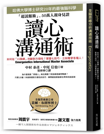 《讀心溝通術》是哈佛大學博士蓋爾˙布朗寧歷經20年權威博士研究,獨創出「全腦思維分析系統」的溝通技術,詳實說明人們各種不同個性,並且教會你如何透過「口頭禪」、「發問技巧」和「行為觀察」的技巧來快速看穿各種人,以及無需改變自己就能和任何人都合得來的方法,無論跟誰都能一路順暢溝通,並且建立好交情。