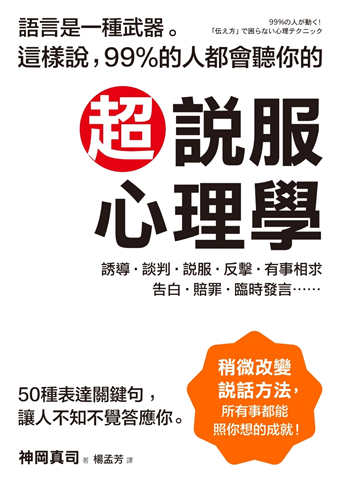 心理溝通專家特別選出50招「成功說服的本事」,舉出在生活中已察覺或未察覺的表達技巧,帶入心理學理論加深印象,讓人可以「直覺」猜到對方的想法,根據這點去回話便能置入自己的意圖影響對方,100%達成說服目標。