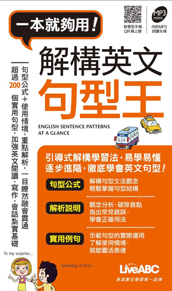 要學好英文除了備好單字片語之外,最好還會靈活的運用一些重要的基本句型。因為在許多狀況下,是沒有辦法用簡單的句子表達,必須用一些特殊的句型,才能完整的傳達意思、情感、語氣。只要掌握句法結構,對於閱讀英文資訊、用英語交談、寫英文書信等都會有所助益。