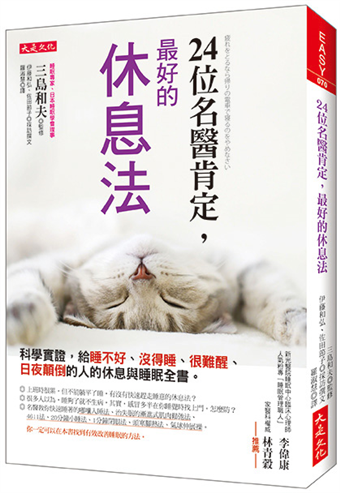 《24位名醫肯定,最好的休息法》透過24位日本睡眠相關領域專家的訪談彙整,清楚描述了前述睡眠的功效(提升記憶力、減少睡眠不足對記憶力的影響等)、睡眠習慣上須調整的注意細節(像避免在回家的車上睡著、不睏不上床等)、提升睡眠品質的方法(睡前泡澡、伸展操與漸進式肌肉鬆弛法、如何選擇寢具、控制室溫等)。