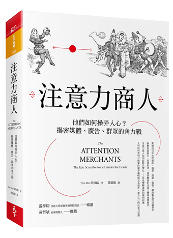 這次,他的新書《注意力商人》更進一步,從報紙、海報、廣播、電視到網際網路,以「商業模式的突破及轉進」為主題,拉出一條綿延兩百年的軸線,貫穿其間的是「大眾注意力如何透過免費媒體的交換,被中介商收編,成為一種可變現的商品」。