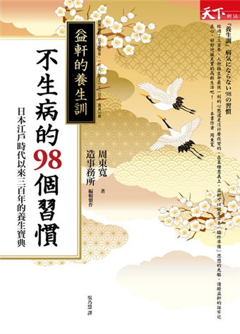 如今天下雜誌出版部日本館,挑選這本彙集日本江戶時代的保健聖經《養生訓》的好書,作者周東寬披沙揀金,共選出九十八個與現代人生活習慣有關的問題,定名為《不生病的98個習慣》,相信此書定能稽古揚新,帶給現代人更多的健康。是以為序。