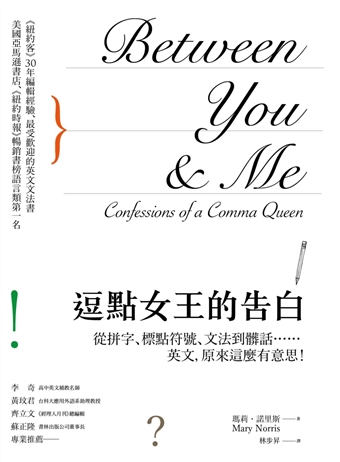 我本身也是英語學習者,雖然在大學任教多年、英文造詣尚佳,但我仍必須承認,自己對英文文法的一些細節仍不甚了解,甚至時有混淆,因此必須在家中及研究室堆放數本文法書以便隨時查閱。不過在拜讀完瑪莉.諾里斯(Mary Norris)的《逗點女王的告白》後,我才了解,原來不只非母語者(non-native speaker)對英文文法如此困擾,多數母語者(native speaker)對它也是一知半解,犯錯連連呢!