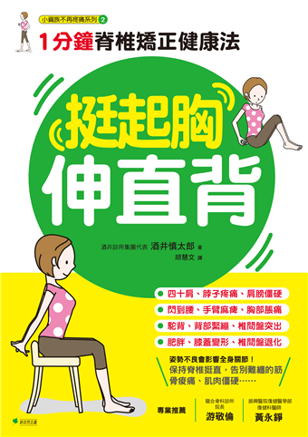 習慣彎腰駝背,是不是非常嚴重呢?!還好,只要將姿勢調整過來,一切就不會太遲。酒井慎太郎不藏私地公開簡單、容易進行的「6大脊椎矯正術」,例如:將下巴挺出,用手指沿水平方向將下巴向後推、十指在背後相互扣住,然後反弓腰背,將背後的雙臂緩緩抬高……只要早晚10分鐘,就能幫你拉直脊椎、改善姿勢問題。