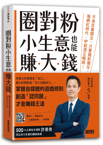 作者序 用對方法,不論生意大小都有新風景! Step 1_爆 你也可以是「爆品」 ▍晉升 A 咖之路,先打破三個陷阱 陷阱 1 假斜槓的毒藥 / 陷阱 2 長尾效應的幻想 / 陷阱 3 YouTuber 的誘惑 ▍社群定位,自我評估四面向 專業:要進入這門知識,你最強 / 痛點:如何解決顧客心中的痛點 /興趣:硬底子專業之外,軟實力是 plus / 連結:透過強樞紐牽線,找到對的人 ▍把錢花在行銷刀口上 下廣告的三個迷思 / 花對錢,可以壓縮時間 ▍這六招教你:小錢做市調,找到顧客真痛點! 實地體驗對手產品 / 從「網路評價」抓出顧客在意的痛點 / 跨行學習,從他人優點中借鏡 / 線上問卷,從社群用戶了解 / 免費體驗調查 /聰明的捷徑,找專業人士當顧問 ▍把夢做大 使命,支持你走下去 /讓夢想成真的五個思考 Step 2_鎖 讓粉黏住你 ▍從認識你到想見你 完全不認識:想辦法先引起興趣,注意到你 / 產生興趣:讓用過的顧客分享,產生共鳴 / 決定交往:激勵消費者採取行動,購買產品 ▍付費與超級用戶,衡量品牌的核心 梳理出五類粉絲 / 抓出超級用戶 / 讓人買單前⋯⋯先思考讓利 ▍一次線下見面,勝過十篇線上文章 召喚潛水客 / 殭屍粉絲大復活 ▍形象和促購,同時達標 引流小心機 / 能轉化,必轉化 Step 3_圈 闢拓內容影響疆域 ▍擅長做與應該做 找到社群戰場 / 社群與獲利 / 與對的人說對的內容 / 六種產製內容的方式 ▍經營自媒體,先自我體檢 找到最小的施力點 / 知道對誰說話,再決定說些什麼 / 以終為始,認清目的 / 六個月成為真正的微型網紅 ▍走入人心的三個妙招 拒絕罐頭,回歸感動 / 從單行道,變成雙向道 / 讓更多人,加入擴散行動 ▍三種 fu,召喚粉絲站出來 限定 VIP 的專屬感 / 群體活動的參與感 / 線下見面的歸屬感 ▍每一天,都推動品牌累積 設定創作鬧鐘 / 用 PDCA 優化社群經營 / 為何 KOL 發布的商業文可能沒人看 Step 4_賺 獲利是需要練習的 ▍要賺錢,練功三部曲 刻意練習的九種方法 / 成為頂尖者的一萬個小時 / 從「想很多」到「想更遠」 ▍讓顧客回購你的專業,五個致勝要訣 主菜、小菜、甜點都美味 / 慣性養成 / 持續優化購買流程:順、快、感 / 一次溝通一個痛點 / 給顧客分級服務 ▍用知識轉換現金 台灣知識訂閱平台閱兵 / 如何打造一門熱銷的線上付費課? / 評估買氣的五度思維 ▍小生意賺大錢:圈對粉五個實踐步驟 好記、好聯想、好上口:用力想出對的名字 / 鎖粉:由核心到外圍層層不放過 / 社群經營三合一:目標、內容、互動 / 借力使力擴圈子:重要樞紐、意見領袖、推廣者 / 賺錢的商業模式:打造顧客心中的超級IP 圈粉練習 社群定位評估練習 / 你是將帥還是小兵? / 你有一份「神隊友」清單嗎? / 換你把流量引進來 / 掌握你的目標客群 附錄① 經紀人正進化 附錄② 企業與 KOL 的合作策略 結語 致親愛讀者的一封信