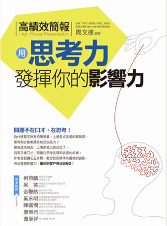 名人推薦:周教授累積多年職場及教學經驗,將如何做好簡報有系統歸納分析,整理出五個錯誤及十個重要觀念,非常精闢,非常實用。我極力推薦此書給所有希望改進溝通及做簡報的讀者。