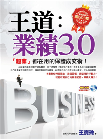 我將研究與歸納多位超級業務最核心的銷售精華,及無數業務員奔波、思考、行動的銷售經驗,濃縮總結成46個王道關鍵,著成這本名為《王道業績3.0》的業務讀本,文字中潛藏著無數卓越銷售人才經歷成功和失敗之後蓄積的無窮力量。本書從銷售觀念、技巧再深入至精髓,分成業績1.0、業績2.0、業績3.0三階段,為業務員搭建起突破業績的成功框架,告訴業務員如何從平凡業務員中脫穎而出,成為經驗豐富的優秀銷售人才,又從優秀的銷售人才成長為成就卓越的業績之王。