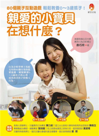 今日榮幸拜讀袁巧玲老師的著作《親愛的小寶貝在想什麼?》,書中以行為分析學的角度,建立0至3歲每個時期孩子所必須學習與建立的能力,並且利用生活周遭容易取得的簡單道具,DIY設計有助於孩子語言、社交、情感、動作及認知發展的遊戲,比起市售的玩具多了一分創意,也多了一分趣味。