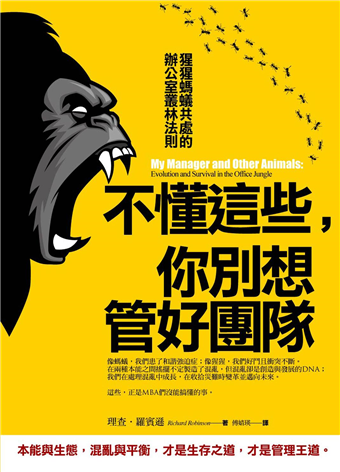 當然,獨木難撐天,所以除了要當猩猩,我們天生也會像螞蟻一樣找盟友,在共識中一起合作,在別人需要時扶他一把。就螞蟻的本能來說,和諧是必須的,受苦是甘願的。事實上,不論是工作或生活,我們是螞蟻也是猩猩,也必須兼具螞蟻與猩猩這兩種動物屬性。當我們建構社會和公司時,我們需要內心深處的螞蟻,而當我們面臨選擇與競爭時,我們更需要猩猩。這兩個截然不同的物種,存在於我們的內心深處,讓我們能在辦公室叢林中生存下去,在該站出來凸顯自己時扮演猩猩,在該遵循服從法則時扮演螞蟻。這種又對立又和諧的衝突性難免有碰撞,常有引發混亂,甚至造成災難,但正是這種混亂或災難,人類才會凌駕於其他物種之上,因為演化歷史已經證明,混亂會加速創造力,而災難會帶來大躍進。這個道理,同樣適用於企業。