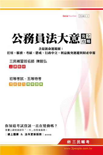 公務員法大意為三民補習班專業權威名師根據初等及地方五等考試命題大綱精編,最新命題範圍包含:任用、服務、考績、懲戒、行政中立、利益衝突迴避與財產申報。深入淺出的內容,聚焦公務員法必考重點!助您把握精華、掌握高分、打造堅強應考實力!