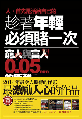 ■ 暢銷書作家張禮文,繼《窮人與富人的距離0.05mm》、《30歲代表了什麼》、《20幾歲,決定男人的一生》、《20幾歲,你要改變什麼》、《35歲,活著是一件非常複雜的事》,系列作品突破400,000冊,2014年又推出強力鉅作!