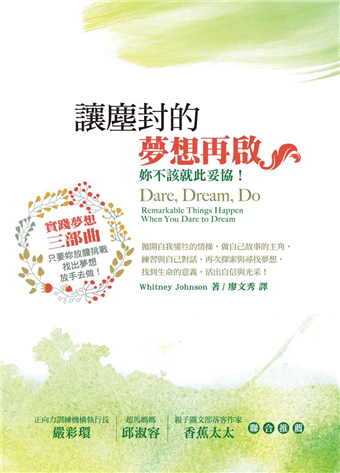 這本書將藉由作者及多位女性朋友所分享的追夢故事,來幫助妳傾聽自己內心的聲音,並依循著放膽挑戰(Dare)、找出夢想(Dream)、放手去做(Do)等三步驟,探索自我,重拾塵封已久或挖掘出全新的夢想,為生命再次注入新的火花,發揮所長並付諸行動去實踐,開創出更有意義的人生!
