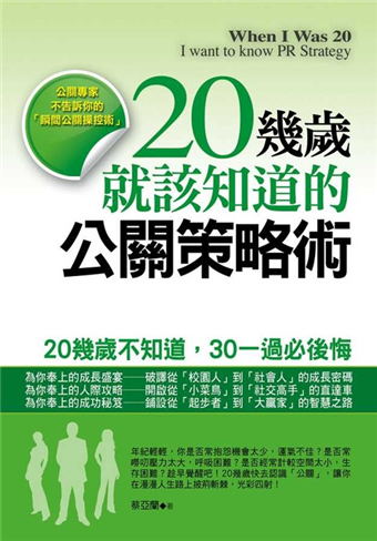 《20幾歲就該知道的公關策略術》就是為年輕人提供的一部公關戰略書。本書從公關的作用、規則開始說起,談到教你快速準確地識人、操控人心的技巧,並且更進一步地談到職場、宴請、談判、銷售、兩性相處等的公關方法,最後為大家提供即時講話的一些技巧以及九型人格提高自己影響力的方法等。本書內容實用,方法可操作性強,且充滿智慧,是20幾歲年輕人必備的公關寶典。