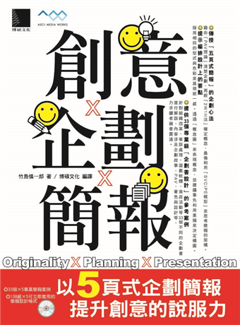 在日本著有多本企劃簡報暢銷書的竹島 慎一郎老師彙整多年經驗和心得,再度提出了「五頁式企劃簡報」的解決方案,從邏輯推理與編排設計兩個層面來著手建構,以回應職場中更多元化的提案需求。