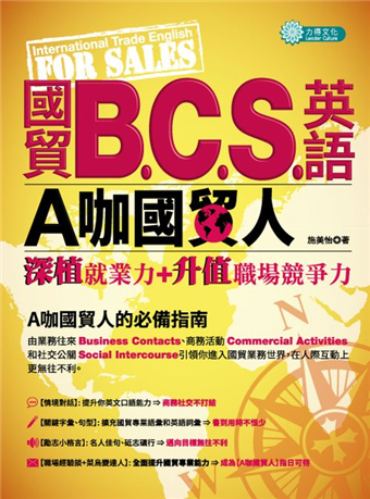 《國貿B.C.S.英語–A咖國貿人》在架構上藉由【情境說明】、【情境對話】、【中文翻譯】、【關鍵字彙】、【關鍵句型】、【勵志小格言】以及【英文書信這樣寫】、【知識補給】、【職場經驗談】、【菜鳥變達人】等單元,讓您晉升為A咖國貿業務,全面提升國貿專業能力以及英語力。