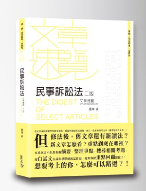 文章書相較解題書沒那麼吃香,I know!因此,我想說,本書要怎麼用才能燃燒這價值,第1,如果您看到密密麻麻文字會有噁心感、對於文章掌握不良,您可以使用這本書;第2,如果您在參考書上僅僅看到「肯定」、「否定」、「甲說」、「乙說」會慾求不滿而想要know more,您可以使用這本書;第3,如果您想要快速複習整部民訴法(包括家事法),您可以使用這本書!!!