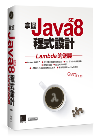 換句話說,Java面對其他語言的競爭,提出了Lambda運算式這項利器,並且在某種程度上,能夠取代為人所詬病、常見於視窗程式(事件傾聽處理)的內部匿名類別。故而本書副標取名為《Lambda的逆襲》以彰顯Java SE8的企圖。