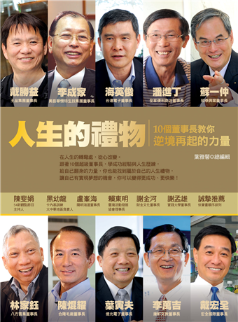 大家健康雜誌出版這本《人生的禮物:10個董事長教你逆境再起的力量》,集結臺灣各產業知名的企業董事長,包括王品集團董事長戴勝益、美吾華懷特生技集團董事長李成家、台達電子董事長海英俊、全家便利商店董事長潘進丁、和泰興業董事長蘇一仲、八方雲集董事長林家鈺、合隆毛廠董事長陳焜耀、億光電子董事長葉寅夫、康軒文教董事長李萬吉、宏全國際董事長戴宏全等10人的人生精彩故事。