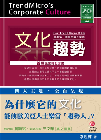本套書是出版界第一次以套書的方式呈現一家企業的成功故事,集合產學媒體界的逾10人寫作團隊,歷時三年、深入兩岸,親自訪問趨勢科技位於南京市地鐵大樓的中國研發中心(CDC)、並採訪多位趨勢公司成員後,全面呈現第一品牌的經營智慧。