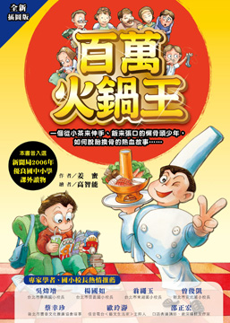 《百萬火鍋王》一書於2006年曾入選聞局第27次優良中小學課外讀物推介,是一本勵志型的小說。如今改版再次發行,除了版面重新設計,也搭配了彩色插圖,最特別的是,穿插了互動式的圖框設計,讀者們可自行將角色的對話或內心獨白寫上,讓整個故事更有自己的想法。期望改版的新設計能給予讀者全新的閱讀感受,並啟發讀者文字創作的興趣。