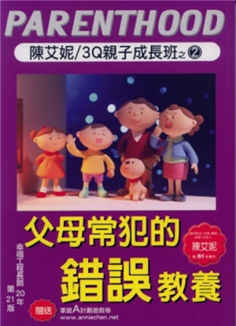 世上最真、最無條件的愛是親子之愛,最久最大的投資是教育子女,3Q父母想要教養出3Q子女,就必須避免20種錯誤教養,並完成8項親子三昧幸福工程。 現代家庭最大的付出,就是教養子女。但是近20年來,因為由西方傳來的教養觀念盛行,而傳統的威權教育又被大家否定,所以,著作百本,具有社會學、心理學、長期諮商個案經驗的作家陳艾妮完成了一套東方理念的親子教育系統-----3Q親子成長班。套書共分兩大部份,第一部份是現代父母常犯的錯誤;第二部份是現代父母應該做的8大任務!而父母的錯誤教養的第二本書,重點是: ●不要陪他成長 ●不要太早強調獨立 ●不要教子女冷漠 ●不要和子女訂約 ●不要濫用讚美 ●不要子女凡事聽話 ●不要教他說謊 ●不要誤用隱私權 ●不要助長偶像崇拜 ●不要教子女迷信