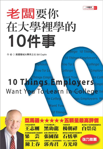 外貿協會董事長王志剛卡內基訓練負責人黑幼龍考選部部長楊朝祥奧美整合行銷傳播集團董事長白崇亮神通電腦副董事長兼總經理果芸銘傳大學教育所所長張國保摩根富林明資產管理副總經理石恬華美加文教機構董事長陳上春台灣萊雅人力資源部總經理郭秀君104人力銀行公關經理方光瑋◎推薦序 培養「即戰力」是大學生最重要的課題 104人力銀行公關經理方光瑋 104人力銀行2008社會新鮮人就業現況調查,今年社會新鮮人畢業三個月後,僅36%順利就業。是什麼原因,讓這些大學畢業生的職涯第一步跨得如此艱辛呢?探究其因,今年就業市場競爭空前激烈,6~8月,104人力銀行每月線上平均求職人數高達45萬,創12年來新高。依照過往數據推測,未來求職競爭激烈程度勢將有增無減。分析這45萬求職者的組成,八成以上是有經驗求職者,其中更不乏競逐開放給社會新鮮人的職缺(無工作經驗要求職缺)的人。結果是今年企業開放給社會新鮮人職缺中,有62%是被有經驗求職者應取了,這凸顯了職場「即戰力」的重要性。所謂「即戰?」,是進入職場上?需再指導,?需再磨?,??需再培養能夠?刻開始工作的能?。準備一份讓老闆心動的履歷表 所以,「即戰力」的養成是當前大學生最重要的課題。本書作者BillCoplin教授,提出的十大技能與額外的加分技能,正符合當前台灣就業市場對於「即戰力」的期待。而作者更有系統的提出了大學生「即戰力」養成的策略與參考做法,讓同學從大一就開始為自己四年後準備好一份能讓老闆心動的履歷表。 我特別建議大學生參照Coplin教授對於「即戰力」養成的架構,配合104人力銀行提供的服務,讓自己可以有更有效率的養成「即戰力」。 首先,要探索個人的職業興趣,你可以上到104職涯發展中心網站(www.104career.com.tw/),透過各類職涯測驗,找出個人的職業興趣與對應的工作職務。接下來,到104人力銀行網站搜尋與個人職業興趣相符的實際職務空缺,去了解要勝任這些工作,你需要準備好什麼樣的能力。這時候你會發現,本書中所提出的十大技能,將真實的出現在就業市場中各類職缺需求中。當然還會有額外的加分技能是你需要進一步準備。然後,你可以參考書中提供的許多圖表工具,規劃建構自己的學習日程表。而學習日程中,作者特別強調工讀、實習的重要性。你可以上到104人力銀行學生實習專區(www.104.com.tw/cfdocs/project/0705/intern_070507/index.cfm)與學生打工專區(www.104.com.tw/student/2005/search_job.cfm),按書中建議的應徵面試技巧,爭取當中的實習、工讀機會,為你畢業時的履歷表爭取加分。 最後你可能會想問:我是不是學好書中的十件事,未來就可以保證得到一份好工作?我引用書中載述美國國父喬治.華盛頓的話回答你:「我們無法確保成功,但我們能擁有成功的資格」。希望你能在大學裡用心學好每一件事,將來成為一位具備成功資格的畢業生。