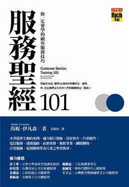 「企業的服務態度,永遠是顧客心中首要的考量。優質的服務,正是顧客再度光臨的真正原因!」~王品集團董事長 戴勝益「服務,是每個企業必須落實的第一門課。本書使用最直接的案例來說明顧客服務之於企業的重要性,我真心推薦它!」~台灣房屋首席總經理 彭培業「客服的道理看似簡單,但就算訂了再多準則,最重要的仍是『將心比心』的臨場應對及處理。」~夢時代購物中心總經理張國光「顧客覺得值得,就沒有價格問題,這也是現今服務業的成功與否的分水嶺。作者在本書中以深入淺出的引導,讓服務的價值提升變得非常簡單,是要做好顧客服務價值的企業,不可錯過的一本好書。」~小林眼鏡公司總經理 朱慶忠