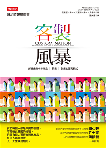 這本書,告訴我們客製風暴形成的原因,以及在身在其中的成功致勝之道;這本書,帶領我們深入了解客製化生產將全面影響產品樣貌、生產模式,甚至行銷架構,幫助我們做好準備,迎接客製化時代的來臨!這本書,說明客製化是很高明的經營模式,反映人類長久以來潛藏的慾望;現在,就是客製化創業的大好機會!
