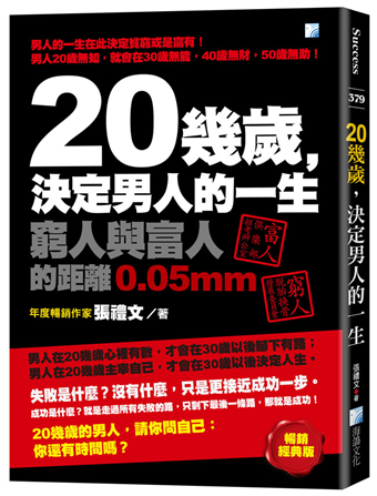 男人20歲無知,就會在30歲無能,40歲無財,50歲無助!男人在20幾歲怎麼做,決定30歲以後怎麼活!男人想在30歲以後得到,就要在20幾歲做到!