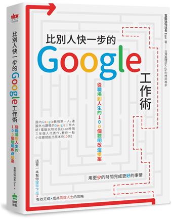 《比別人快一步的Google工作術:從職場到人生的100個聰明改造提案》就是秉持這個原則設計,由我真實的職場工作經驗出發,一個一個工作流程與環節去拆解,看看這裡有哪些步驟可以利用Google工具省下來?哪些行動可以因為Google方法更有效率?具體且經過驗證,希望也能為你帶來脫離瑣事地獄的效果。