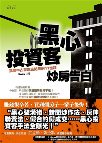 多花冤枉錢事小、買到黑心拉皮屋事大,更慘的是買到違建或兇宅還不自知!《黑心投資客炒房告白》公開投資客黑心伎倆的17堂課,教你要如何降低風險、掌握議價空間。