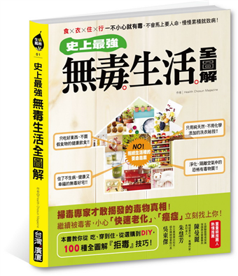 您手中這本「無毒生活全圖解」是一本簡單易行,只講重點的居家健康生活參考書,只要每天挑一兩樣徹底執行,很快的就會發現家裡的氣場開始流通,自己的身手也會越來越熟練敏捷。先把看得見的髒亂處理乾淨,那些看不到的細菌汙濁自然會減少,全家人的健康也會因此加分。