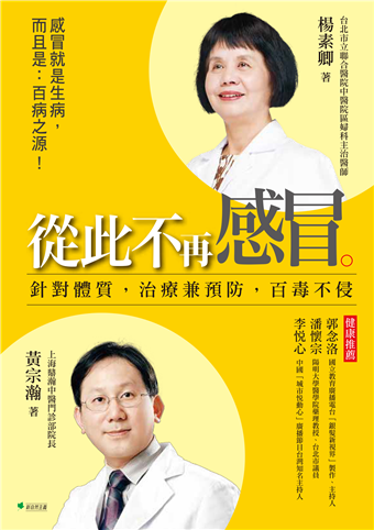 .2大名中醫聯手教你終結感冒、預防百病、體質養生:擁有四十多年臨床經驗的資深女中醫師楊素卿,與上海首位執業的台灣籍中醫師黃宗瀚,聯手打造台灣第一本破解各種感冒症狀、預防百病的體質養生書!傾力傳授老祖宗生活智慧,教你因人施治掌握感冒照料重點和方法,避免感冒威脅、重拾健康。