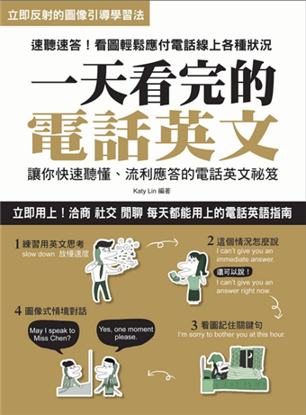 用英文講電話時,最難的是「正確聽懂對方的意思」,並且「正確表達自己的意思」,電話英文常常都是使用「慣用字」與「慣用句」,例如:接到找自己本人的電話時,「我就是」可不能說「Yes, I am.」,而是說「Speaking」;「轉接電話」可不能說「I will give him your call.」,而是最常用「I will put you through.」。學會這些基本電話句,就能夠展現你的英文能力與專業度!本書每個單元的開始,都有附中英關鍵字的四張圖片,搭配與圖片內容相關的英文關鍵字,在圖片的引導下,輕鬆記起各種「電話英文慣用句」,讓你從接起電話到掛斷電話,對話能夠一路順暢不中斷。
