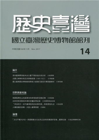 本期收錄3篇論文、4篇田野調查短論以及 l 篇論壇文章,臺灣史議題論文中裴澤霖的〈 清末臺灣開港後米出口量下限的估計與分析,探討清末米穀問題,將臺灣區分為北部和南部地區,透過麻袋進口量與米出口量之相關性,推測臺米在開港後出口量最下限,認為米穀仍然是開港後出口商品裡的大宗。另一篇為李鎧揚的 北臺士紳陳秋菊及其事業經營(1895 一 1922)一文,以臺灣北部出身的陳秋菊日治時期經歷為例,討論反抗新政權的土匪,在歸順後的發展,兼論新統治者如何與士紳階層建立緊密關係。