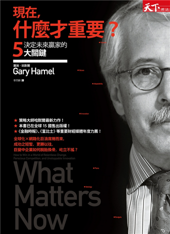 哈默爾,世界一流的策略大師,以新書《現在,什麼才重要?》探討這個問題,將問題的核心分為「價值觀」、「創新」、「調適力」、「熱情」、「意識型態」等五大互補的面向,提出企業如何在快速變化的環境中適應未來的建議。然而經營企業時,這五大面向往往交互影響,產生更多複雜的變化。在這種情況下,變與不變的關鍵為何?企業所秉持的準則又是什麼?企業要能不斷進化,才能避免僵化,伴隨著進化的創新與改變將帶來希望與危險,也充滿機會與挑戰,這是企業邁向未來時無法逃避的抉擇。