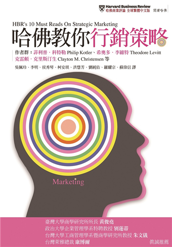 本書集結全球頂尖管理雜誌《哈佛商業評論》中行銷大師的文章,包括著名的哈佛商學院行銷學教授希奧多.李維特(Theodore Levitt,1925~2006)、西北大學凱洛管理學院特聘講座教授菲利普.科特勒(Philip Kotler)、創新管理大師克雷頓.克里斯汀生( Clayton M. Christensen)等的文章,提供一張思考行銷新未來的清單: