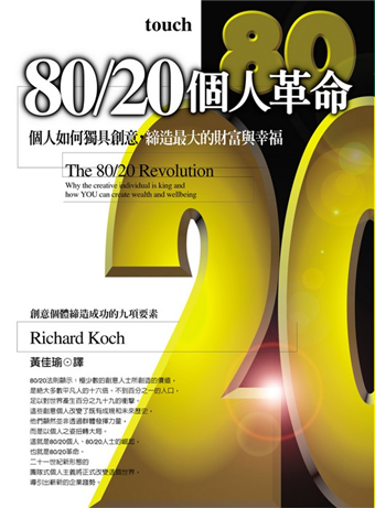 作者在暢銷書《80/20法則》中,首度揭示企業如何運用這套法則來追求商業成效,以及個人如何改善他們的個人生活。《80/20個人革命》則有一個截然不同的主題,討論了80/20法則與個人崛起之間的環節,以及如何經由該法則的九項成功要素,完成個人專業生涯的規劃與實踐。以往,全體與機構是財富與福祉的來源,如今,群體沒落,個人興起,整體社會及商業環境將隨之轉型。全新型態的團隊式個人主義將會是這個新趨勢下的生產主力。