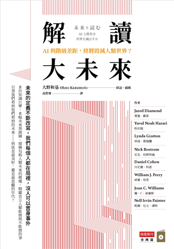 國際新聞記者大野和基親自採訪全球8位重量級知識先驅,從他們的論述、對談之間,讀者宛如親臨演化生物學、歷史、經濟等各界佼佼者的講堂,透過名家之眼,一窺未來世界可能的樣貌,以及攸關生存的關鍵議題。