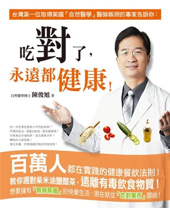 《吃對了,永遠都健康》書中將食物分為油品、調味料、五穀類、蔬果、魚肉豆蛋奶、營養食品六大類,一一剖析它們對人體的影響、正確的攝取方式以及選購的原則等,不僅釐清一般人錯誤的飲食觀念,更要告訴您該如何從外觀、氣味、色澤等條件,去挑選真正健康天然的食材,而非輕信產品包裝上的廣告標語。透過陳醫師精采且專業的文字內容,搭配清楚易懂的圖表與照片解說,讓您成為聰明的飲食選購專家!