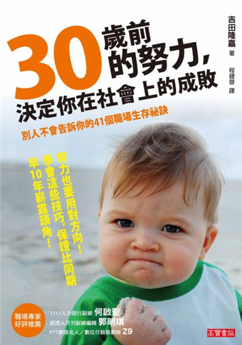 吉田龍嘉身兼不同角色,書中所提示的包括了親身的經驗,也涵蓋學理的研究所得,是極少數能夠同時顧及理論與實際的論述,更難得的是,只要照著吉田龍嘉書中所提到的原則,一一實踐,即使你已年過30,離成功的路都會愈來愈近。
