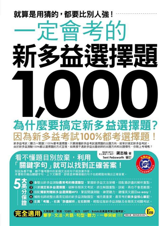全國唯一一本出題相似度直逼100%《一定會考的新多益選擇題1,000:就算是用猜的,都要比別人強!》將帶領各位讀者及考生在新多益測驗或各類英文考試中,用最少的時間獲取高分,絕對是考前3個月必備以及衝刺各類英文考試的專業用書。