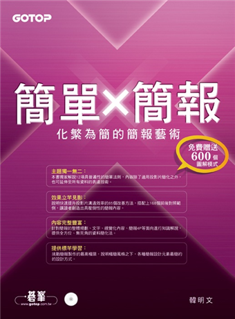 * 獨家揭露簡單法則︰探討一切事物化繁為簡的共通法則,讓簡報者在正確觀念下,建構出具說服力的投影片
