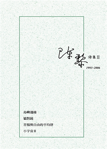 本書收錄陳黎四本詩集《島嶼邊緣》、《貓對鏡》、《苦惱與自由的平均律》、《小宇宙II》於一帙,收詩兩百六十餘首,是中壯年陳黎,一九九三至二○○六年,十三年間詩作的合集。書末並附原有之跋、後記、代序、相關評論,及其書目、寫作年表。