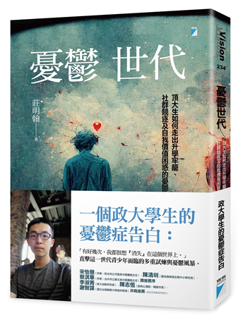 《憂鬱世代──頂大生如何走出升學牢籠、社群競逐及自我價值困惑的憂鬱症》雖然只是一個大學生的「憂鬱斷代史」,卻有好多的力量蘊藏在其中。這股力量是整個時代都需要的力量。──摘自蔡淇華主任推薦序