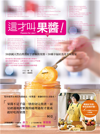 一、50款最in風味果醬:堅持使用在地農產品製作果醬,不辭辛苦跑遍台灣大小農園尋找,只為了使用無毒或有機食材熬出最原始且純粹的一抹果醬。自己做果醬,用新鮮水果,用健康食材,不用化學原料,沒有人工色素,一切天然無毒,吃得安心,多好;自己做果醬,步驟簡單,即便是新手也能作出令人驚艷的好味道,成就感十足。